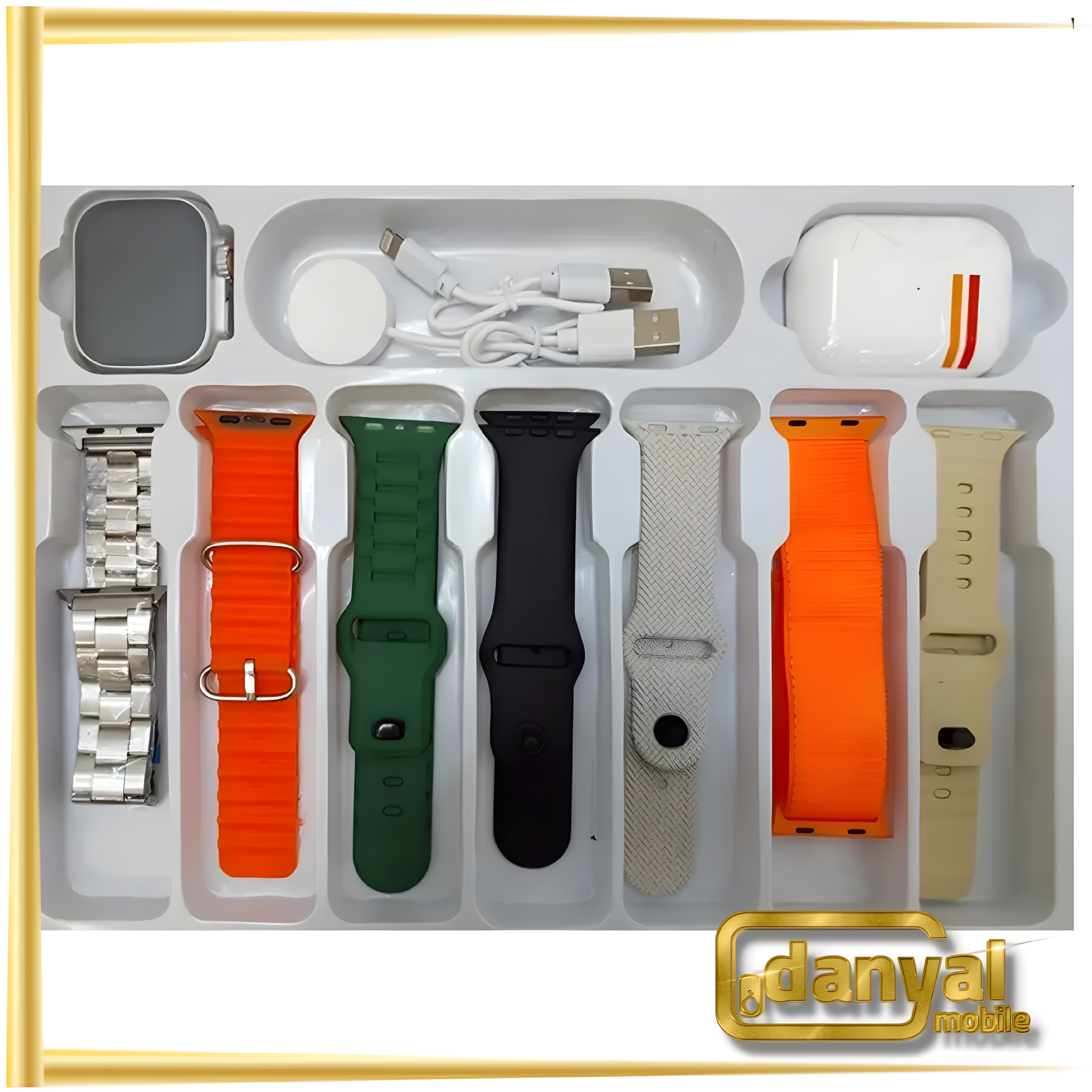 یک عدد ساعت هوشمند WS-80 ULTRA 2/ یک عدد ایرپاد پرو 7 عدد بند های مختلف یک عدد سیم شارژ وایرلس ساعت هوشمند 1 عدد سیم شارژ ایرپاد پرو